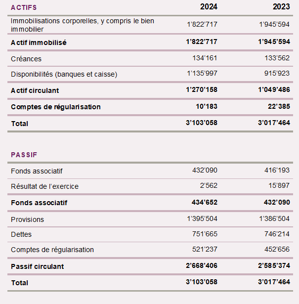 L’exercice 2024 s’est soldé par un résultat global tout juste positif de 2 600 francs (16 000 francs en 2023). Les fonds propres ont par la suite légèrement augmenté pour atteindre 435 000 francs (432 000 francs en 2023).